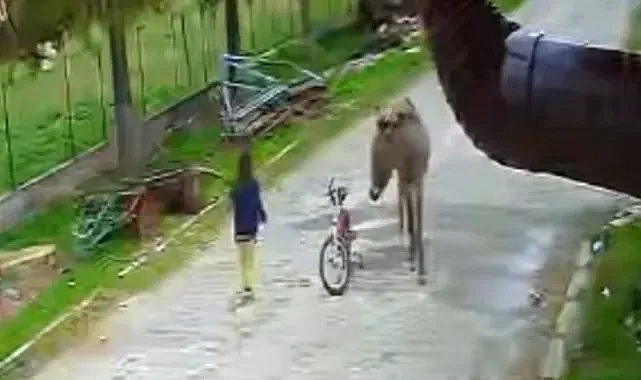 Afyonkarahisar’ın Çay ilçesine bağlı Akkonak köyünde, 4 yaşındaki F.D.A. evinin önünde bisikletle oynarken komşuya ait olduğu öğrenilen başıboş bir eşeğin saldırısına uğradı. Olay, güvenlik kamerasına yansıdı.