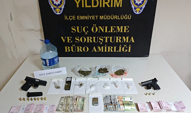 Bursa Emniyet Müdürlüğü Yıldırım İlçe Emniyet Müdürlüğü'ne bağlı Yıldırım Suç Önleme ve Soruşturma Büro Amirliği ekiplerince yapılan çalışmalarda, Yeşil Mahallesi'ndeki bir ikamette uyuşturucu madde ticareti yapıldığı ve ruhsatsız silah bulundurulduğu bilgisine ulaşıldı.Hakkında 4 yıl 2 ay kesinleşmiş hapis cezası bulunan Yelid A.’nın adreste saklandığını belirleyen ekipler, uyuşturucu maddelerin pencereden ya da lavabodan dökülmesini engellemek için motokurye kılığına girerek eve yaklaştı.Şüphelilerin durumu fark etmemesi üzerine adrese eş zamanlı ve ani baskın düzenlendi.Uyuşturucu, silah ve para ele geçirildi