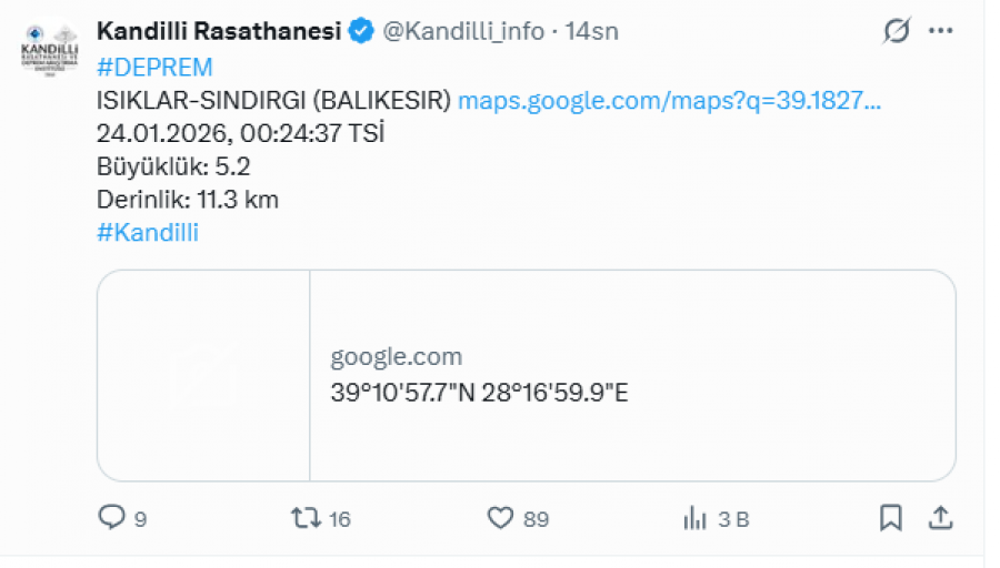 Bursa Yayınlanma: 24 Ocak 2026 - 00:41 Bursa'da hissedilen deprem korkuttu! Bursa'da gece saatlerinde hissedilen şiddetli bir deprem meydana geldi. Gelen ilk bilgilere göre deprem Balıkesir Sındırgı'da gerçekleşti. Bursa 24 Ocak 2026 - 00:41 Yorumlar TAKİP ET Yazdır A Büyüt A Küçült Yorumlar Kandilli Rasatahnesi 5,2 büyüklüğünde saat 00,24'te meydana gelen depremin yerin 11,3 kilometre altında gerçekleştiği bilgisini paylaştı. YORUMLAR adlı kullanıcıya cevap x Gönder İlginizi Çekebilir Karacabey Belediye Başkanı Fatih Karabatı Saha Personeliyle Kahvaltıda Buluştu Bursa İnegöl’de Yangın: Tek Yaşayan Adamın Evi Kullanılamaz Hale Geldi Güvenli İnternet Hizmeti 55 Milyon Aboneyi Aştı Gastro İnegöl’de Atıksız Mutfak Günü Son Haberler TikTok ABD’de Yoluna Devam Ediyor TROY Rekor Kırdı TÜBİTAK Burslarına Dev Zam Ekrem İmamoğlu’nun Şaibeli Diploma Davasında Karar Çıktı: Mahkemeden... Karacabey Belediye Başkanı Fatih Karabatı Saha Personeliyle Kahvaltıda... TikTok ABD’de Yoluna Devam Ediyor TikTok ABD’de Yoluna Devam Ediyor