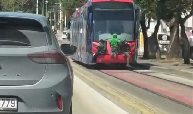 Osmangazi’de hareket halindeki tramvayın arkasına tutunan 3 çocuk, metrelerce bu şekilde ilerledi. O anlar cep telefonu kamerasına yansıdı.