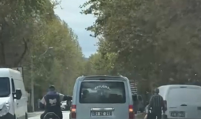Bursa’da bir motosiklet sürücüsü, seyir halindeki arkadaşıyla sohbet etmek için bir elini ticari aracın camına yasladı, diğer eliyle ise motosikleti kullanmaya devam etti.