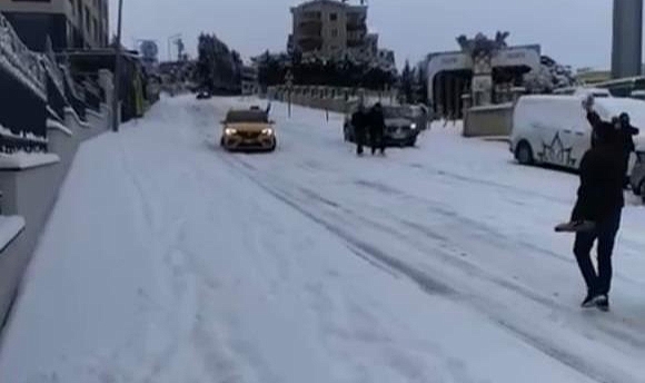 Sanayi sitesinde oluşan kar örtüsünü değerlendiren esnafların keyifli anları, başka bir esnaf tarafından görüntülenerek sosyal medyada paylaşıldı.