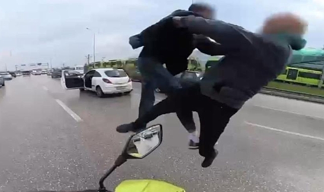 Bursa-İzmir yolu üzerinde yol verme tartışması yüzünden çıkan kavga, uçan tekmeler ve korku dolu anlarla gündem oldu. Kavga, yoldan geçen kurye tarafından durduruldu.
