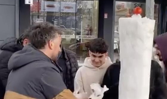 Dağdan topladığı kar kütlesini döner şişine takan Gökhan Güneş, iş yerinin önünde toplanan vatandaşlara “kardan döner” ikramında bulundu. Ortaya çıkan görüntüler, izleyenleri hem şaşırttı hem de gülümsetti.Vatandaşlardan Yoğun İlgi ve Cep Telefonlarıyla Kayıt