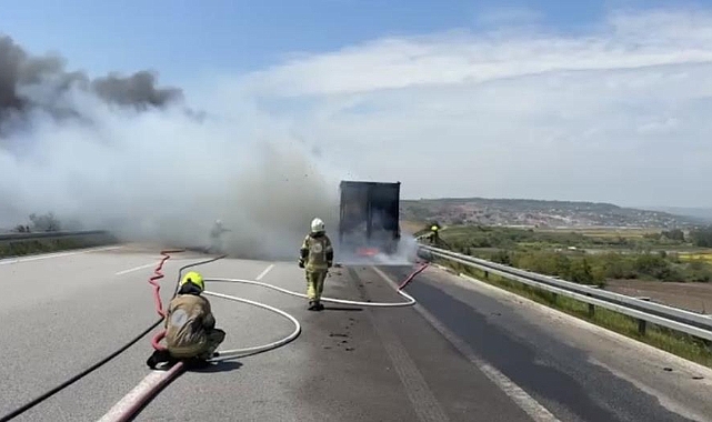 Bursa İzmir Yolu Batı gişeleri mevkiinde seyir halindeki presli karton yüklü bir tırda çıkan yangın, aracı kısa sürede kullanılamaz hale getirdi.