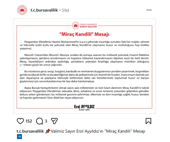 Paylaşımda, Miraç Kandili’nin sevgi, hoşgörü, kardeşlik ve merhamet duygularını yeniden yeşertmek için önemli bir fırsat olduğuna dikkat çekildi. Kırgınlıkların geride bırakılması, birlik ve beraberliğin daha da pekiştirilmesi gerektiği ifade edildi.