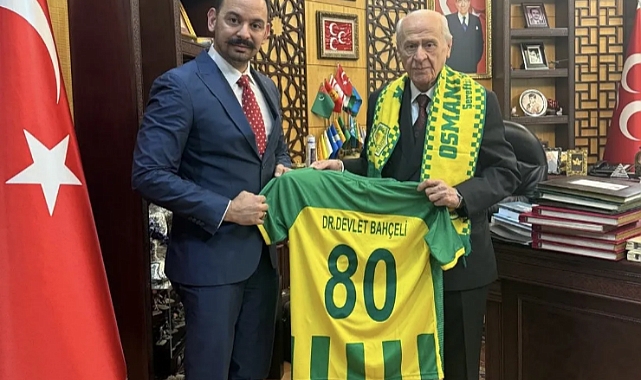 Kobaner, Bahçeli’ye takımın forması ve atkısını hediye etti. Osmaniyespor formasını giyen Bahçeli, hatıra fotoğrafı çektirdi.