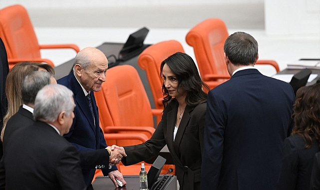 DEM Parti Eş Genel Başkanları Tülay Hatimoğulları ve Tuncer Bakırhan, Genel Kurul salonuna girişlerinin ardından ilk olarak MHP Genel Başkanı Devlet Bahçeli'nin yanına giderek tokalaştı. Kısa bir sohbetin yaşandığı anlar kameralara yansıdı.