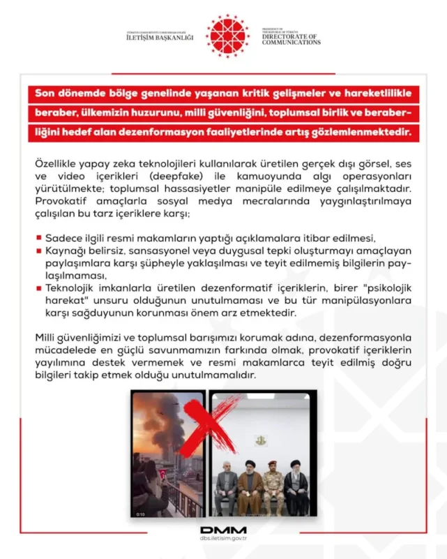 DMM, milli güvenliği ve toplumsal birliği korumanın en güçlü yolunun, provokatif içeriklerin yayılımına destek vermemek ve resmi makamlarca teyit edilmiş bilgileri takip etmek olduğunu belirtti. Uyarı, özellikle bölgedeki gerilimlerin yarattığı belirsizlik ortamında yürütülen dezenformasyon kampanyalarına dikkat çekti. Toplumsal birlik ve milli güvenlik kavramları haberin anahtar kelimeleri arasında öne çıkarıldı.Kamuoyuna Doğru Bilgi Çağrısı