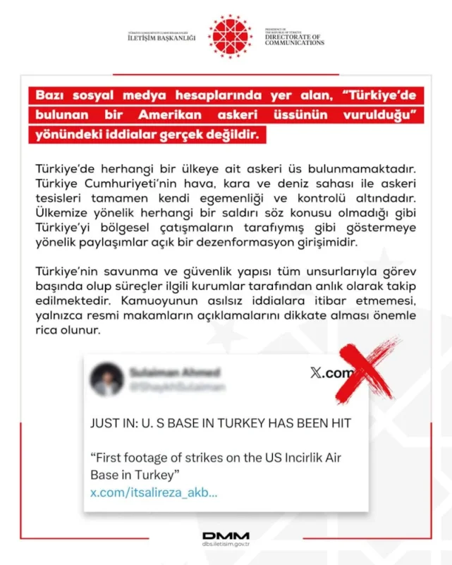 DMM açıklamasında, "Türkiye’de herhangi bir ülkeye ait askeri üs bulunmamaktadır" denildi. Türkiye Cumhuriyeti’nin hava, kara ve deniz sahası ile askeri tesislerinin tamamen kendi egemenliği ve kontrolü altında olduğu belirtildi. Bu iddiaların, Türkiye’yi bölgesel çatışmaların tarafıymış gibi göstermek amacıyla yapılan bir dezenformasyon girişimi olduğu vurgulandı.Güvenlik Önlemleri Tam Kapasiteyle Devam Ediyor