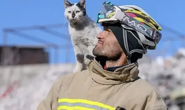 Enkazdan çıkardığı 'Enkaz' kediyi hala yanından ayırmıyor