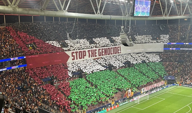 Karşılaşma öncesindeki seremoni sırasında kuzey tribününde kartonlarla Filistin bayrağı oluşturuldu. Taraftarlar aynı anda İngilizce “Stop the genocide” (Soykırımı durdur) yazılı büyük bir pankart açarak tüm dünyaya mesaj verdi.Kuzey tribününde ayrıca “Free Palestine” (Özgür Filistin) yazılı bir pankart da yer aldı. Taraftarlar, tezahüratlarıyla da Filistin halkına desteklerini dile getirdi.GALATASARAY TARAFTARINDAN DUYARLI MESAJ