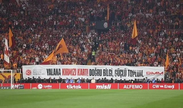 Galatasaray ile Fenerbahçe arasındaki kritik derbide, Cumhurbaşkanlığı İletişim Başkanlığı’nın dezenformasyonla mücadele kampanyası kapsamında farkındalık pankartları açıldı. Mesajlar tribünlerden destek gördü.