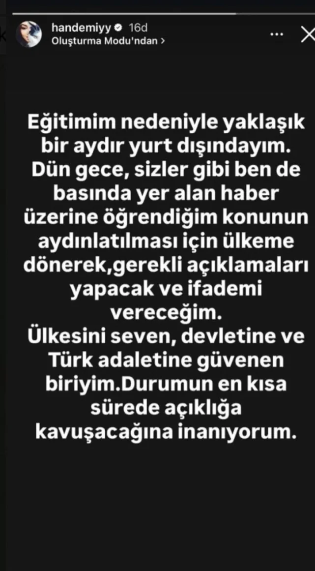 İstanbul Cumhuriyet Başsavcılığı tarafından yürütülen ünlülere yönelik uyuşturucu soruşturması kapsamında hakkında yakalama kararı bulunan oyuncu Hande Erçel, sosyal medya hesabından ilk açıklamasını yaptı.
