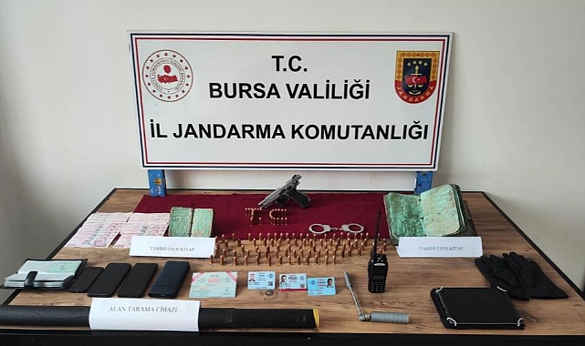 İnegöl İlçe Jandarma Komutanlığı ekipleri, şüpheli hareketler sergileyen aracı durdurdu. Araçta yapılan detaylı aramada; 2 adet tarihi eser niteliğinde kitap, 1 adet Sarsılmaz marka tabanca, 123 adet 45 kalibrelik tabanca mermisi, 1 adet kelepçe, 1 adet el telsizi, 1 adet tablet, 4 adet cep telefonu, 29 bin 800 lira nakit para, 4 adet "Polis" ibareli sahte basın kartı ve alan tarama ile yeraltı görüntüleme cihazları ele geçirildi.Şüpheli gözaltına alındı