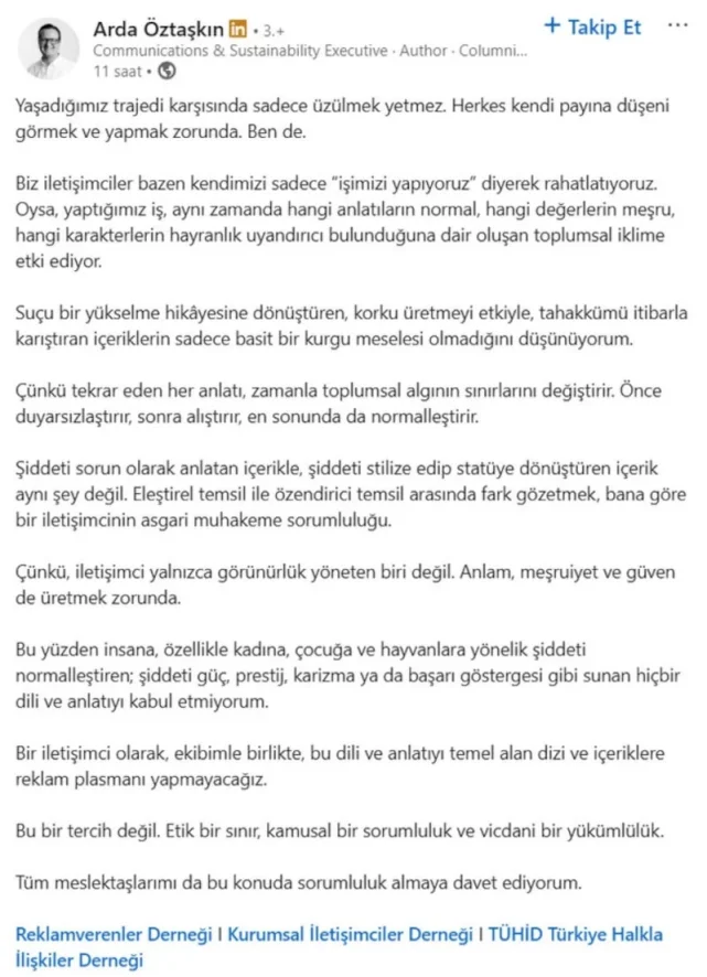 Açıklamada, iletişim alanında faaliyet gösteren kurumların sadece görünürlük değil aynı zamanda toplumsal sorumluluk da taşıdığı vurgulandı. Şiddetin normalleştirilmesini kabul etmeyen bir yaklaşım benimsendiği belirtildi.