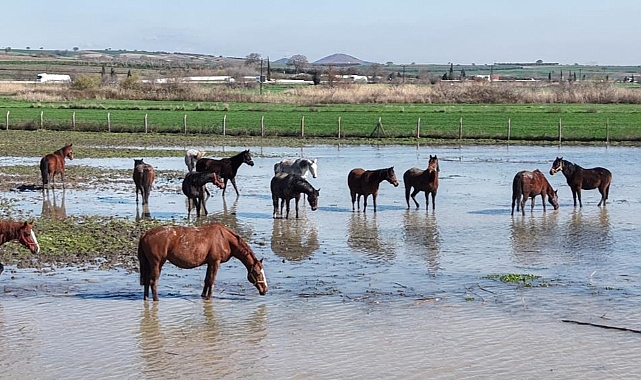 Karacabey yarış atları, su basan arazide gezinti yaparken drone ile görüntülendi. Milyonluk tayların annesi olan damızlık atların büyük bölümünün gebe olması dikkat çekti. Atların sürekli kapalı alanda tutulmasının mümkün olmadığını belirten işletme çalışanları, hayvanları kontrollü şekilde su altında kalan açık alana çıkarmak zorunda kaldıklarını ifade etti. Uluabat Gölü su seviyesindeki artışın bir süre daha devam etmesi bekleniyor.“Göl Suları İlk Kez Bu Kadar Yükseldi”
