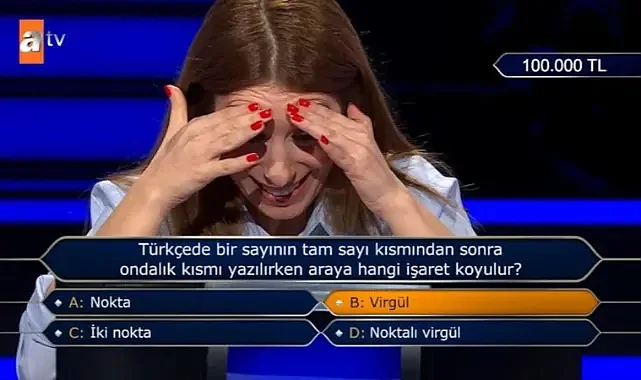 Yarışmacıya yöneltilen dil bilgisi sorusu, Türkçede sayıların yazımıyla ilgiliydi. “Bir sayının tam sayı kısmından sonra ondalık kısmı yazılırken hangi işaret kullanılır?” sorusu, yarışmanın kritik anlarından biri oldu. Bu soru Kim Milyoner Olmak İster tarihinde dikkat çeken sorular arasında yer aldı.Şıklar Yarışmacıyı Zorladı