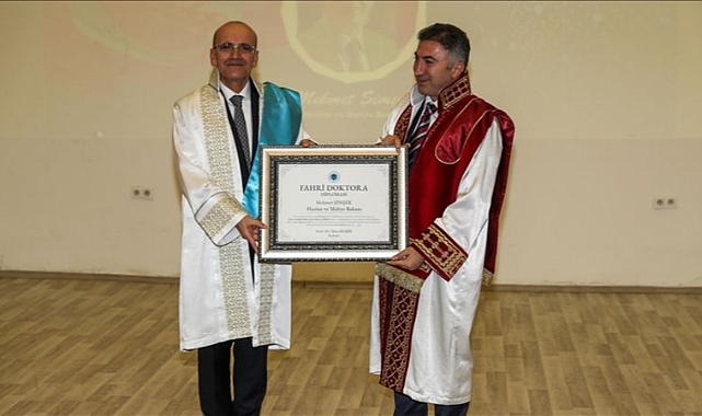 Konferansın ardından Batman Üniversitesi Rektörü Prof. Dr. İdris Demir tarafından, üniversite senatosu kararıyla verilen fahri doktora belgesi Mehmet Şimşek’e takdim edildi ve cübbesi giydirildi.