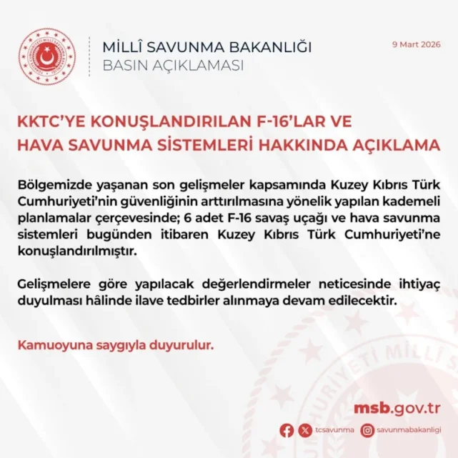 Milli Savunma Bakanlığı tarafından yapılan açıklamada, 6 adet F-16 savaş uçağı ve hava savunma sistemlerinin KKTC’ye konuşlandırıldığı duyuruldu.