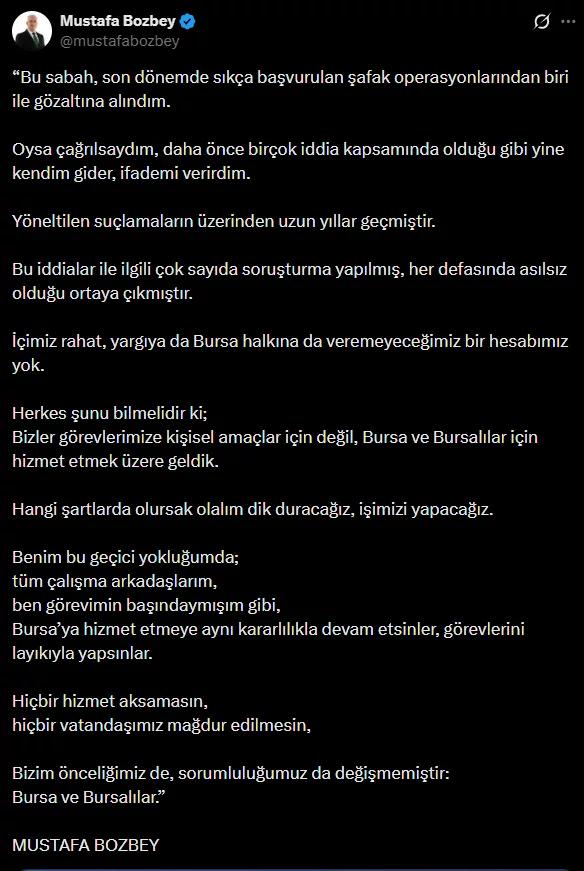 Bursa soruşturma kapsamında gözaltına alınmasının ardından sosyal medya hesabından ikinci kez açıklama yaptı.Yapılan paylaşımda, belediye hizmetlerinin aksatılmaması gerektiği vurgulanırken, Bozbey’in sürece ilişkin değerlendirmeleri kamuoyuyla paylaşıldı.