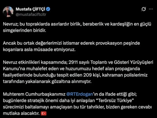 İçişleri Bakanı Mustafa Çiftçi, sosyal medya hesabından yaptığı açıklamada, Nevruz'un asırlardır birlik ve kardeşliğin simgesi olduğunu vurguladı. Çiftçi, “Ortak değerlerimizi istismar ederek provokasyon peşinde koşanlara asla müsaade etmiyoruz” ifadelerini kullandı.