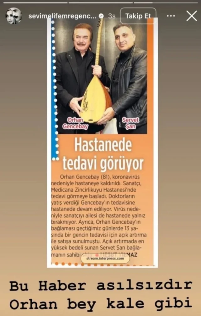 Gündeme gelen iddiaların ardından Sevim Emre açıklama yaparak sosyal medya hesabından bir paylaşımda bulundu. Emre, çıkan haberler üzerine kamuoyunu bilgilendirdi.Sevim Emre mesajında, “Kontrol amaçlı hastaneye bile gidemeyecek miyiz? Orhan Gencebay kale gibi maşallah. Allah onu korusun” ifadelerini kullanarak sanatçının sağlık durumunun iyi olduğunu belirtti.Spekülasyonlara Tepki Gösterdi