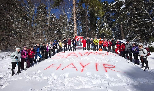 Kulüp üyeleri ve doğaseverler, anlamlı etkinlik sırasında kar üzerinde büyük harflerle 'Savaşa hayır' yazısı yazarak toplumsal duyarlılık mesajı verdi.Uludağ’da 11 Kilometrelik Anlamlı Yürüyüş