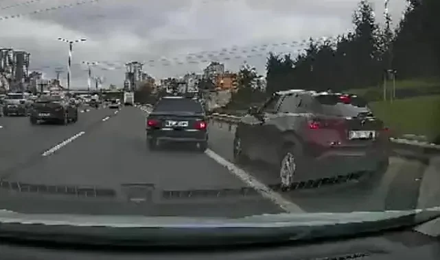 Olay, İstanbul Ümraniye’de D-100 karayolu Kavacık yönünde meydana geldi. 34 UNV 39 plakalı araç sürücüsü, trafikte makas atarak ilerlemeye çalıştı. Ancak önünde bulunan kamyon nedeniyle şerit değiştiremeyen sürücü, sinirlenerek tehlikeli hareketlerde bulundu. Makas atan sürücü, diğer araçları riske atarak trafikte büyük tehlike oluşturdu.Emniyet Şeridine Sıkıştırdı