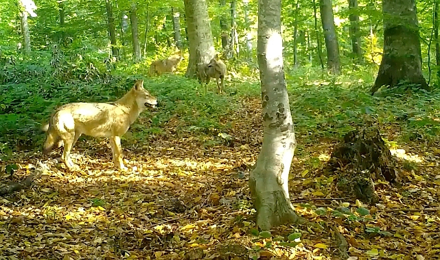 Ormanlık alanda sürü halinde dolaşan kurtlar, yaban hayatının zenginliğini bir kez daha gözler önüne serdi.